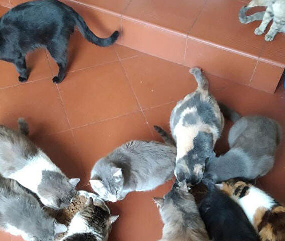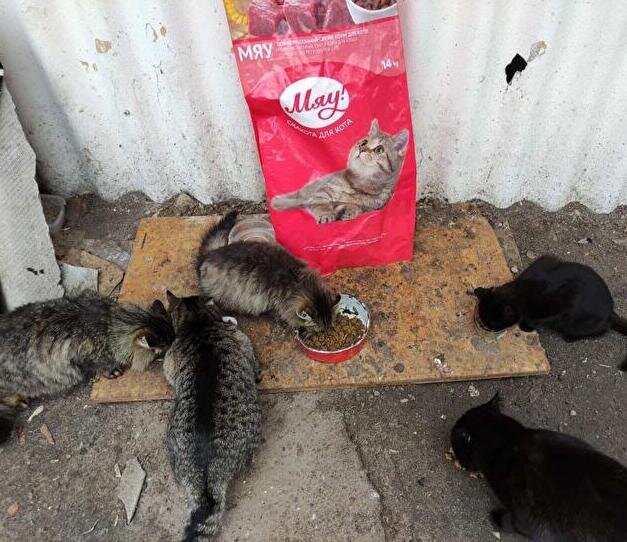 Cats on the streets of Ukraine enjoying their newly delivered food.