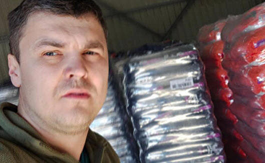 Dr. Klietsov poses with a shipment of animal food inside a storage location. via Dr. Andrii Klietsov