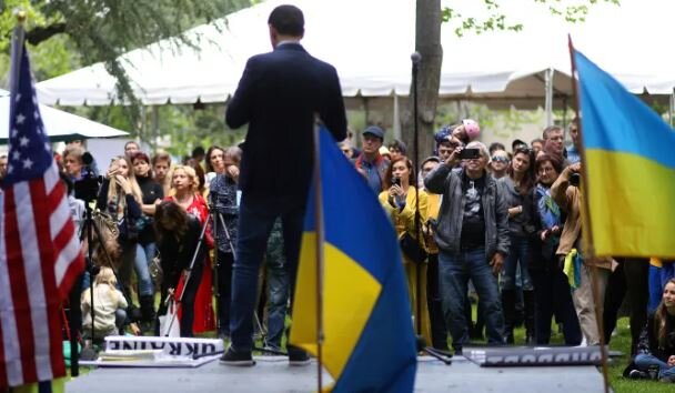 Vasyl Dub, Co-founder & CEO of Animal-ID, speaks to guests attending a Ukraine awareness event at Stanford University.