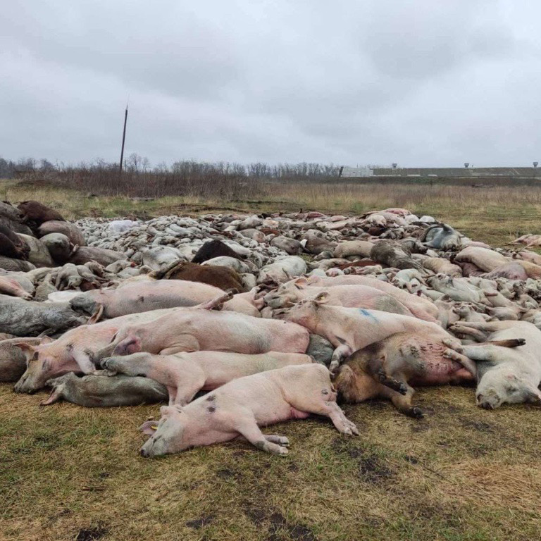 Pigs from pig farm near Kurakhovo are laid in a nearby field that died due to debris from an airstrike or starvation.