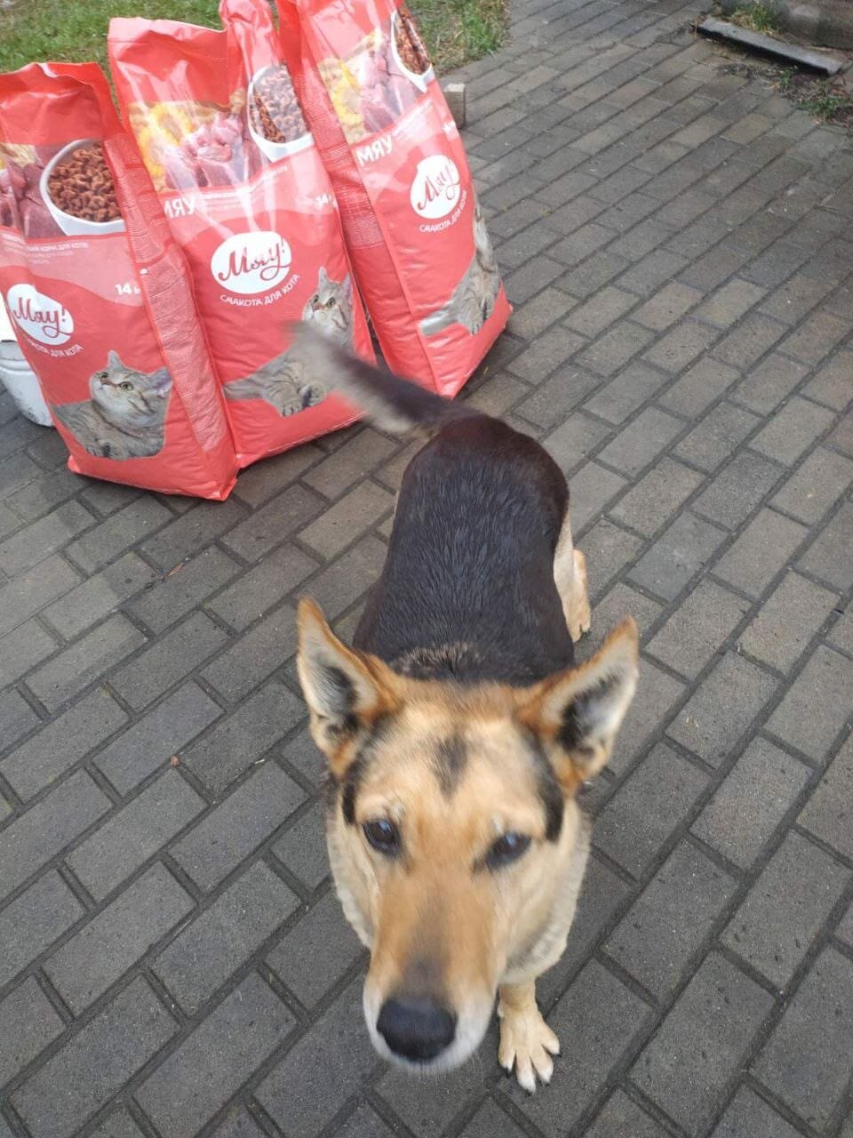 A very grateful German Shepherd with their delivery of pet food delivered by Dr. Andrii Klietsov. via Dr. Andrii Klietsov