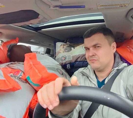 Sumy, Ukraine May 3, 2022 Dr. Andrii Klietsov driving a car loaded with pet food, delivering to those he can reach. via Dr. Andrii Klietsov